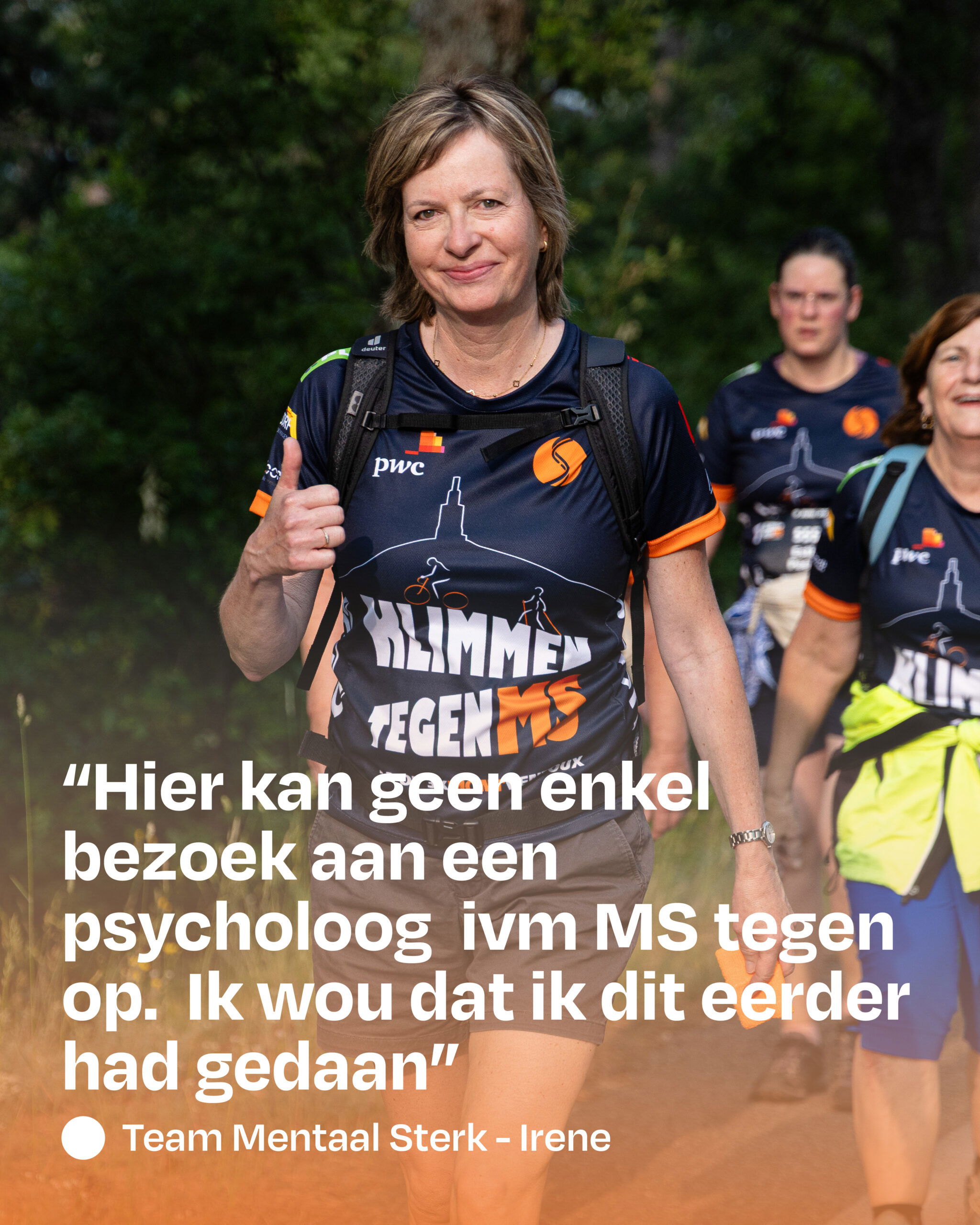 Heb jij de diagnose MS, en wil je de Mont Ventoux beklimmen? Meld je dan aan voor Team Mentaal Sterk, je ontvangt niet alleen begeleiding tijdens de beklimming waar dat nodig is, ook maak je vrienden voor het leven en zal je geïnspireerd worden door anderen. Een onvergetelijke reis, ieder met een eigen verhaal, maar allemaal met hetzelfde doel. Dat is het bereiken van de top! Alle zorgen worden uit handen genomen, je hoeft zelf niks meer te regelen. Wij regelen de reis, het verblijf, leuke activiteiten tot aan gezellige avonden tijdens het avondeten.