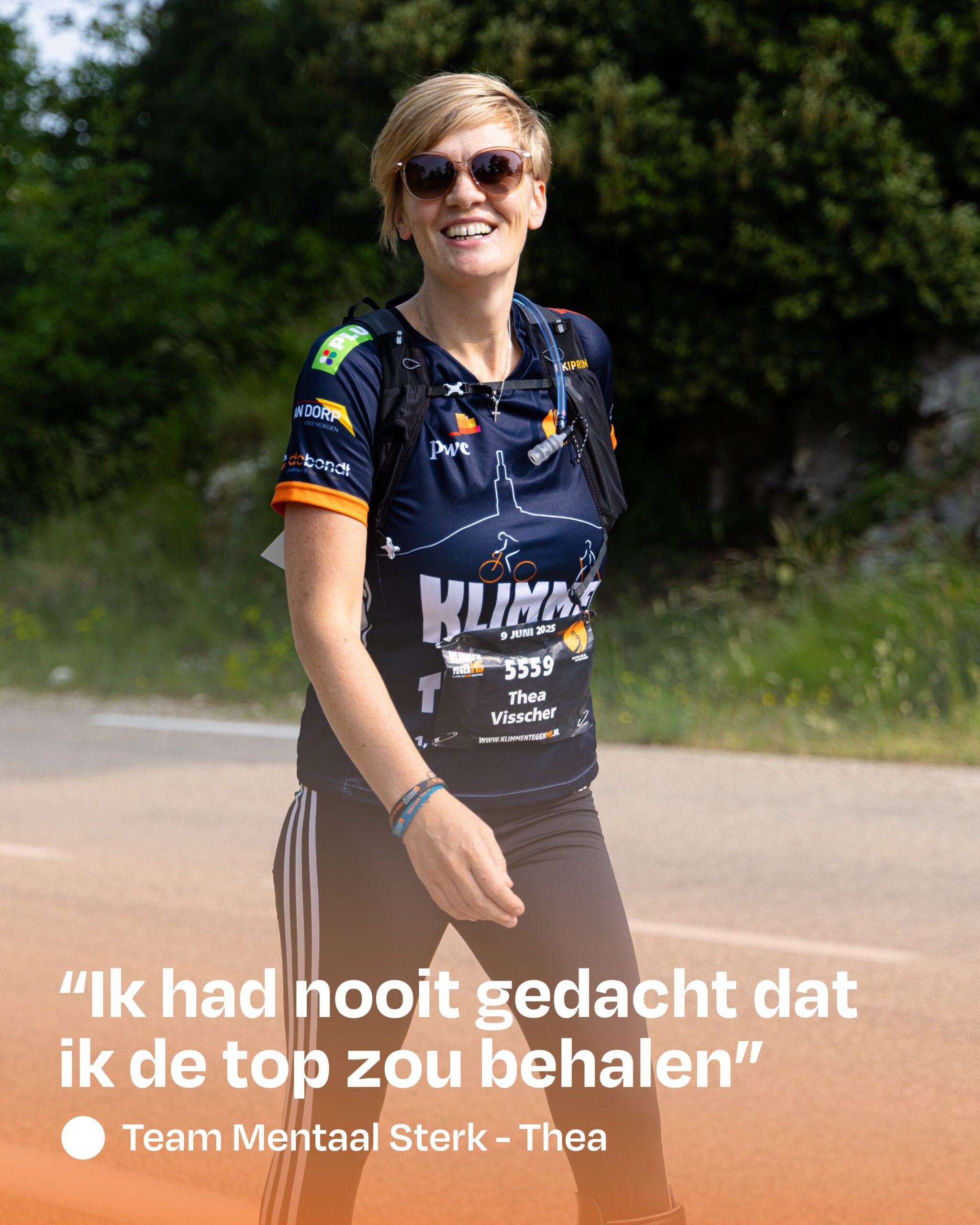 Thea loopt met een enkel-voet-orthese ( EVO) en legt langere afstanden af in een rolstoel. Toch deed ze samen met Team Mentaal Sterk mee aan Klimmen tegen MS. “Het was een fantastische ervaring om de Mont Ventoux te beklimmen. Ik had nooit gedacht dat ik de top zou kunnen bereiken.”